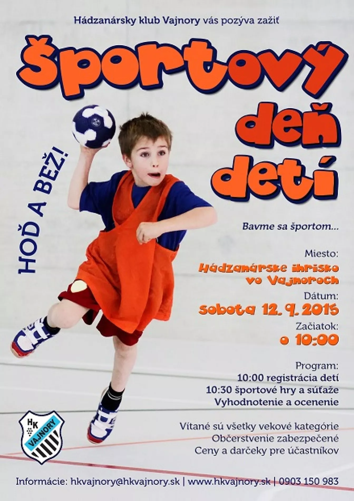Hádzanársky klub Vajnory pozýva všetky deti zažiť veľa zábavy a pohybu na športovom dni detí, ktorý sa uskutoční dňa 12.9.2015 od 10:00 hod na hádzanárskom ihrisku vo Vajnoroch.