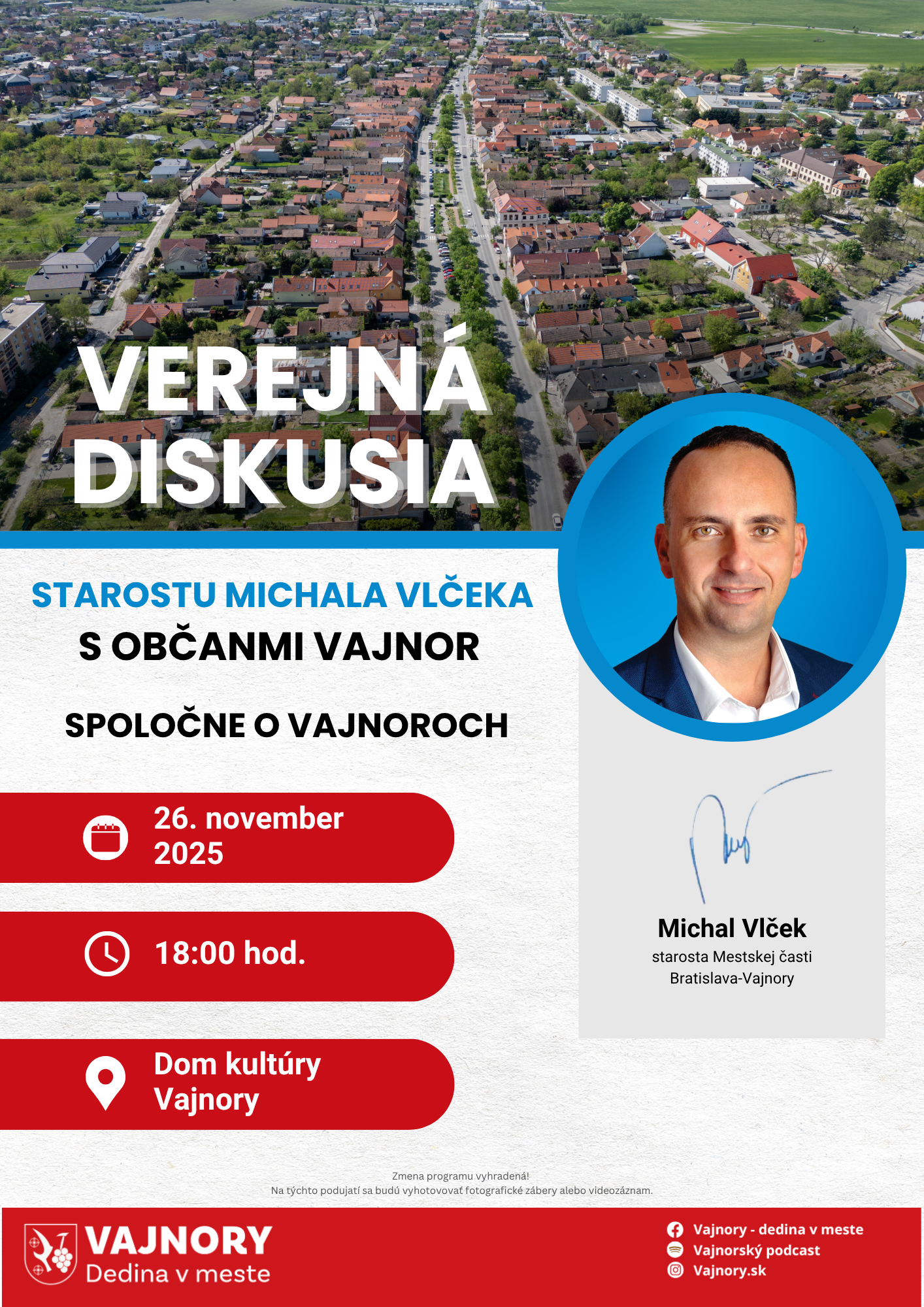 Omrvinka Domov Mestská časť 6.11.2025 calendar_month 26.11.2025 18:00 Pozývame Vás na verejnú diskusiu starostu Mestskej časti Bratislava-Vajnory s občanmi Vajnor, ktorá sa uskutoční v stredu 26. novembra 2025 o 18:00 v DK Vajnory.Tešíme sa na Vašu účasť! zdieľať