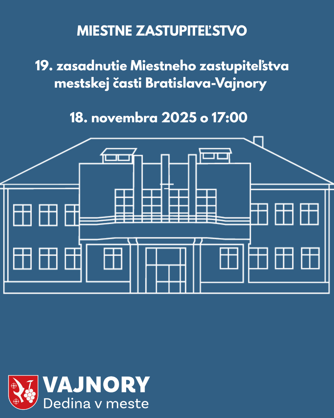 Omrvinka Domov Od jarosova 14.11.2025 19. zasadnutie Miestneho zastupiteľstva mestskej časti Bratislava-Vajnory sa uskutoční v utorok, 18. novembra 2025 o 17:00 hodine v zasadacej miestnosti Miestneho úradu, Roľnícka 109, I. poschodie. zdieľať