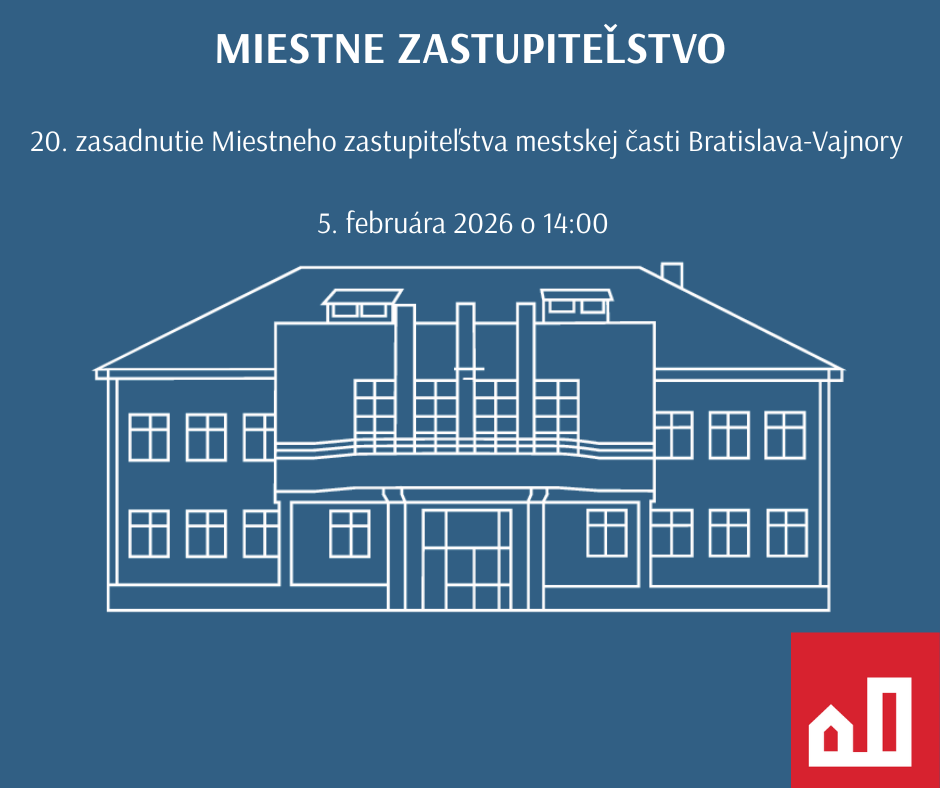 Omrvinka Domov Miestne zastupiteľstvo Od jarosova 2.2.2026 MIESTNE ZASTUPITEĽSTVO20. zasadnutie Miestneho zastupiteľstva mestskej časti Bratislava-Vajnory sa uskutoční vo štvrtok, 5. februára 2026 o 14:00 hodine v zasadacej miestnosti Miestneho úradu, Roľnícka 109, I. poschodie. zdieľať