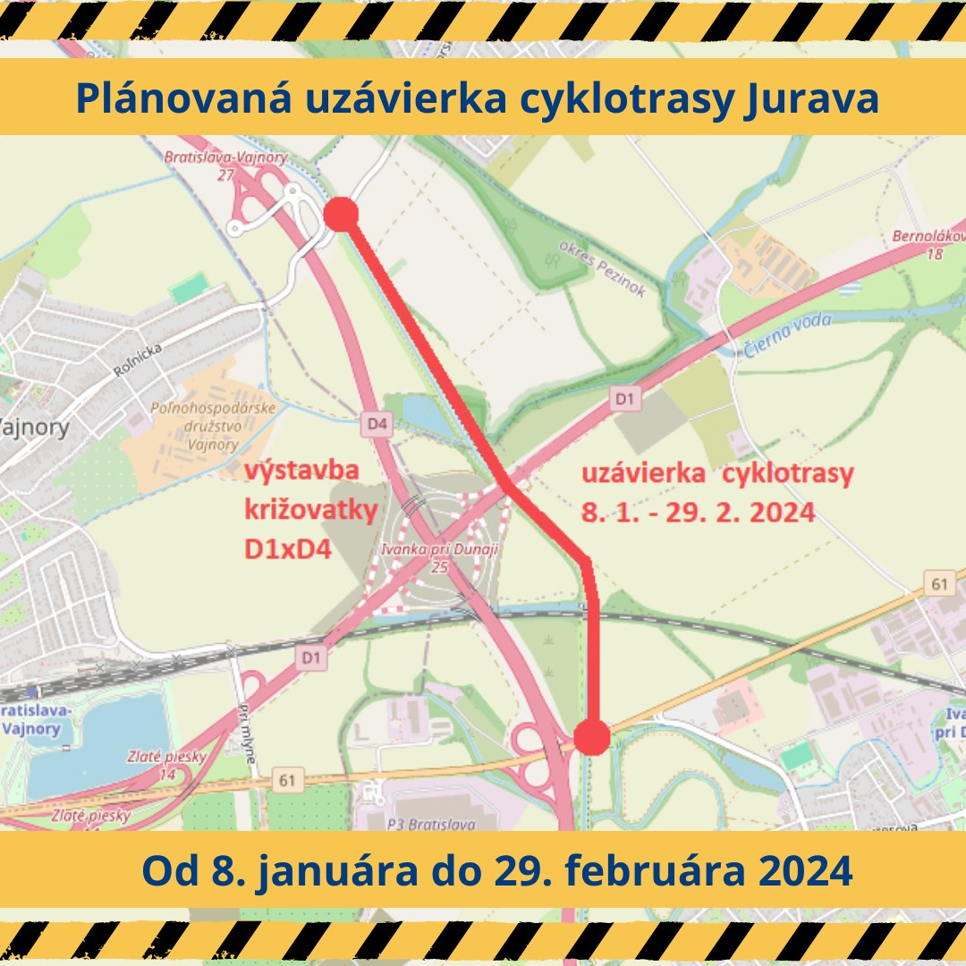 Podľa informácii Bratislavského samosprávneho kraja bude cyklotrasa Jurava medzi Seneckou cestou a mostom Vajnory dočasne uzavretá. Dôvodom je rozširovanie diaľnice D1 a výstavba križovatky D1xD4.