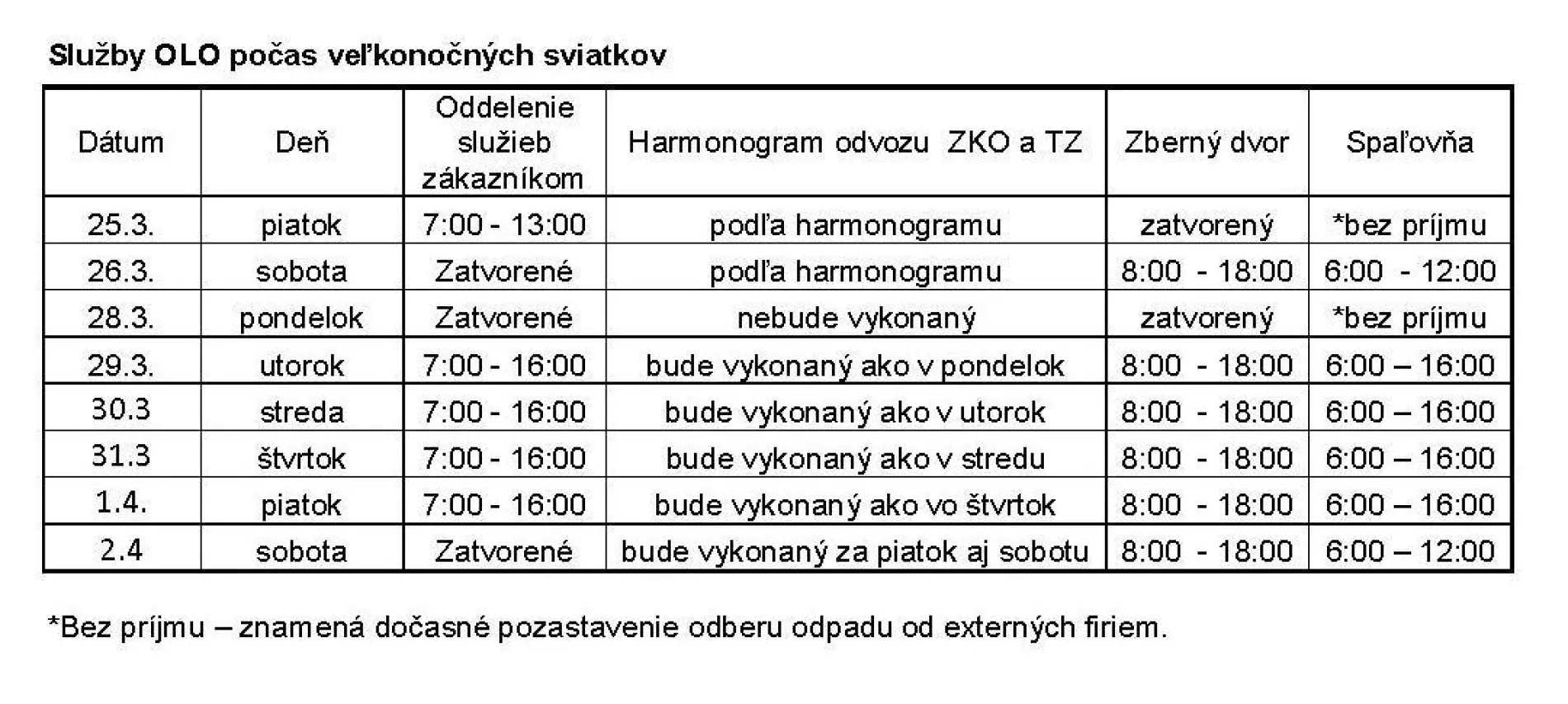 Zberný dvor na Starej Ivanskej ceste 2, ako aj Spaľovňa vo Vlčom hrdle 72, budú 25.3. aj 28.3. zatvorené. Mimo tieto dni bude prevádzka zabezpečená podľa bežných otváracích hodín. Oddelenie služieb zákazníkom bude zatvorené v pondelok 28.3. Kompletný harmonogram služieb OLO počas veľkonočných sviatkov je možné nájsť v priloženej tabuľke, ako aj na webstránke www.olo.sk