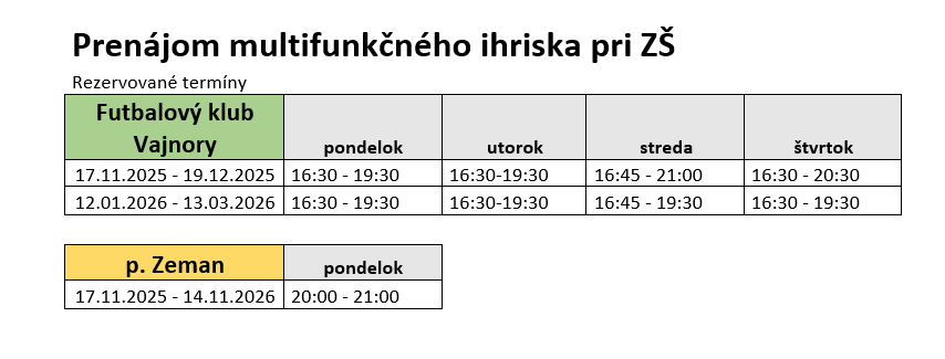 Výška nájomného za užívanie multifunkčného ihriska je 20€ za hodinu / jednorazový i dlhodobý prenájom ihriska je potrebné dohodnúť vopred - najneskôr 48 hodín/