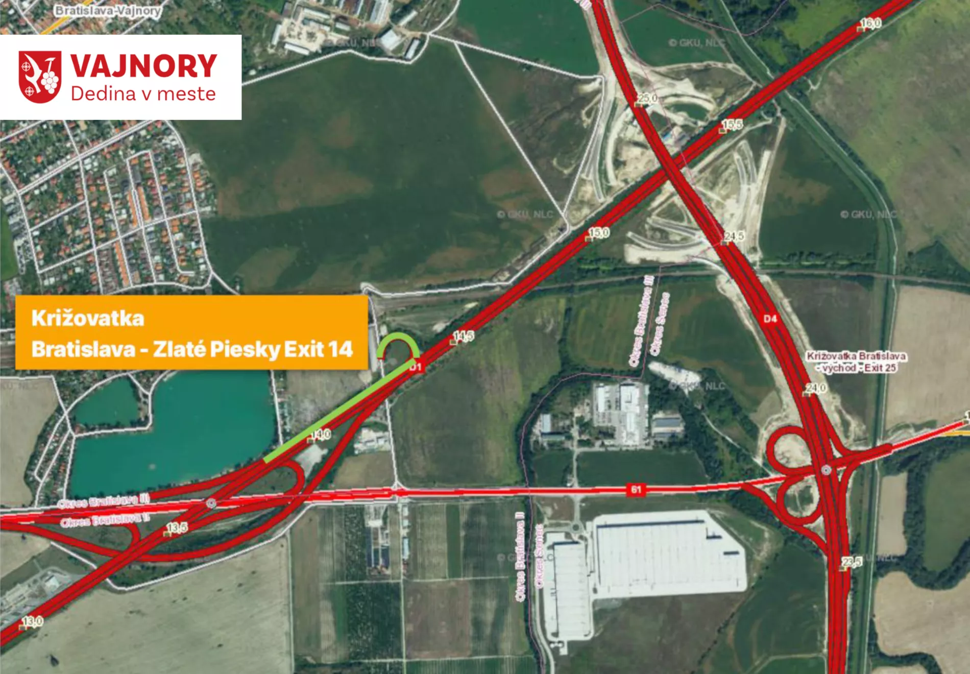 Národná diaľničná spoločnosť upozorňuje vodičov na uzáveru vetvy diaľnice D1 vrátane pripájacieho pruhu v smere z Bratislavy po Zlaté Piesky v km 14,400 – 13,750. Uzavretý bude výjazd z ulice Pri mlyne v bratislavskej mestskej časti Vajnory.